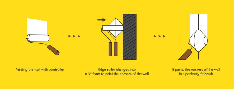 常見的油漆滾筒刷一般是圓柱形的,我們在刷墻壁時往往只能大面積的刷,遇到邊角處需要改用小毛刷,這樣十分不方便。這是Minute Man設計的一款可變形的油漆刷 Edge Roller,從長筒變身碟形只需一步,輕松應對墻面邊角。